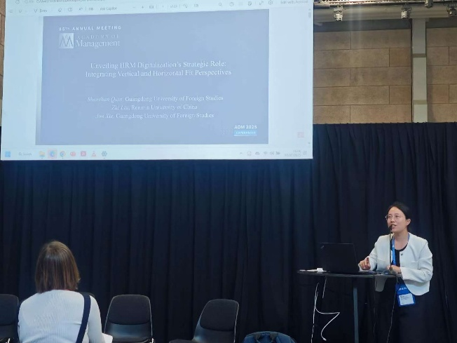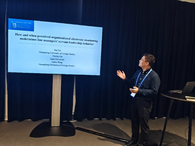 领导力与组织管理系谢俊教授为第一作者的论文“How and when electronic monitoring undermines line managers’ servant leadership behaviors”和钱珊珊老师为第一作者的论文“Unveiling HRM digitalization’s strategic role: Integrating vertical and horizontal fit perspectives”经同行评审后被本次年会接收。两位老师分别在人力资源分会场上进行了论文汇报和交流。展示了公司在数字化转型、人工智能与组织管理领域的学术成果。