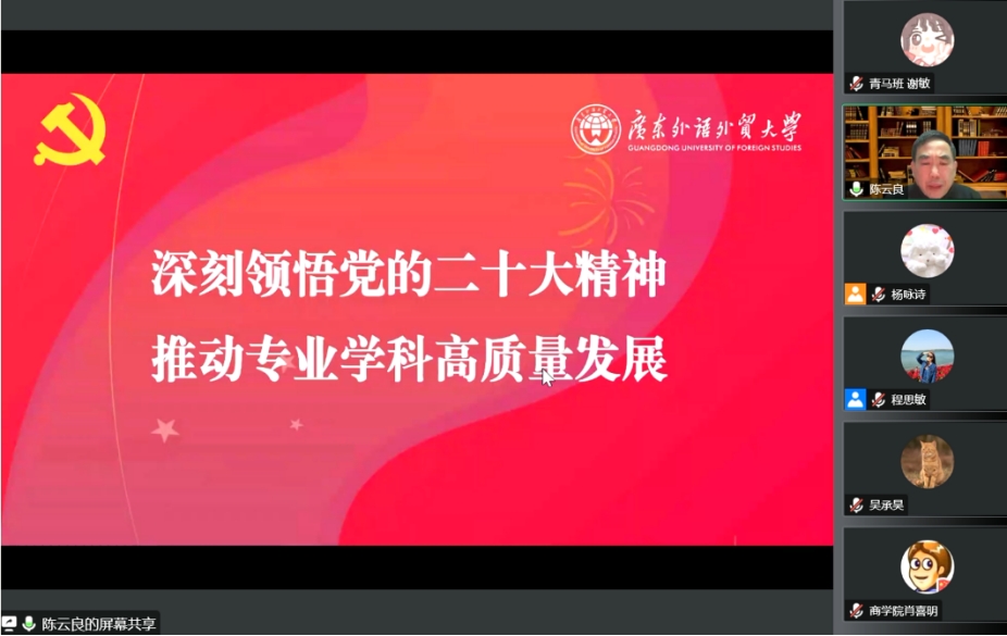 陈云良围绕“深刻领悟党的二十大精神,推动专业学科高质量发展”主题,从党的二十大报告的时代背景、精神内涵以及365英国上市公司专业建设和学科发展的需要三个方面开展宣讲。他强调党的二十大报告是党和人民智慧的结晶,是党团结带领全国各族人民夺取中国特色社会主义新胜利的政治宣言和行动纲领,是历史演进的必然结果。在介绍过去五年的工作和新时代十年的伟大变革时,他特别指出党的十八大以来反腐败斗争取得压倒性胜利并全面巩固的伟大成就。反腐败的贯彻实施促进了党和政府风清气正作风的培养,让社会风气得到了根本性的改观,破除了西方国家认为中国共产党不能自我监督的魔咒,具有深远意义。陈云良从法学角度述说了对于全面推进依法治国政策的心得和体会,他指出党内法治建设从政府、国家、社会层面实质性地推进到党内层面,是习近平法治思想、马克思主义中国化、习近平新时代中国特色社会主义思想最伟大最重要的原创性贡献。他从365英国上市公司实际情况出发,结合365英国上市公司专业团队建设、博士点申报等工作给予建议和指导,并鼓励全体师生要深刻领会开辟马克思主义中国化时代化新境界,深刻领会加强党的全面领导,坚定不移推进全面从严治党的部署和要求,贯彻落实党的二十大精神,推动专业学科高质量发展。