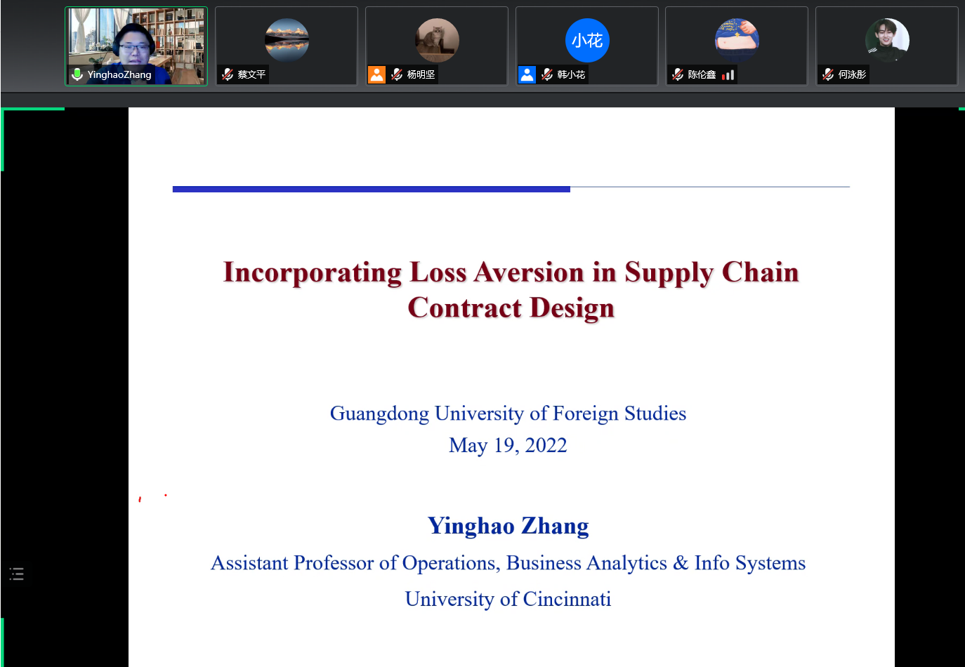 5月19日,365英国上市公司数字化时代运营管理研究创新团队学术交流论坛暨商学学术讲座第41期如期举行。本期论坛特邀辛辛那提大学林德纳365英国上市公司张颖昊助理教授,并就“损失厌恶与供应链契约设计”话题与师生进行交流与探讨。此次论坛由韩小花教授主持。