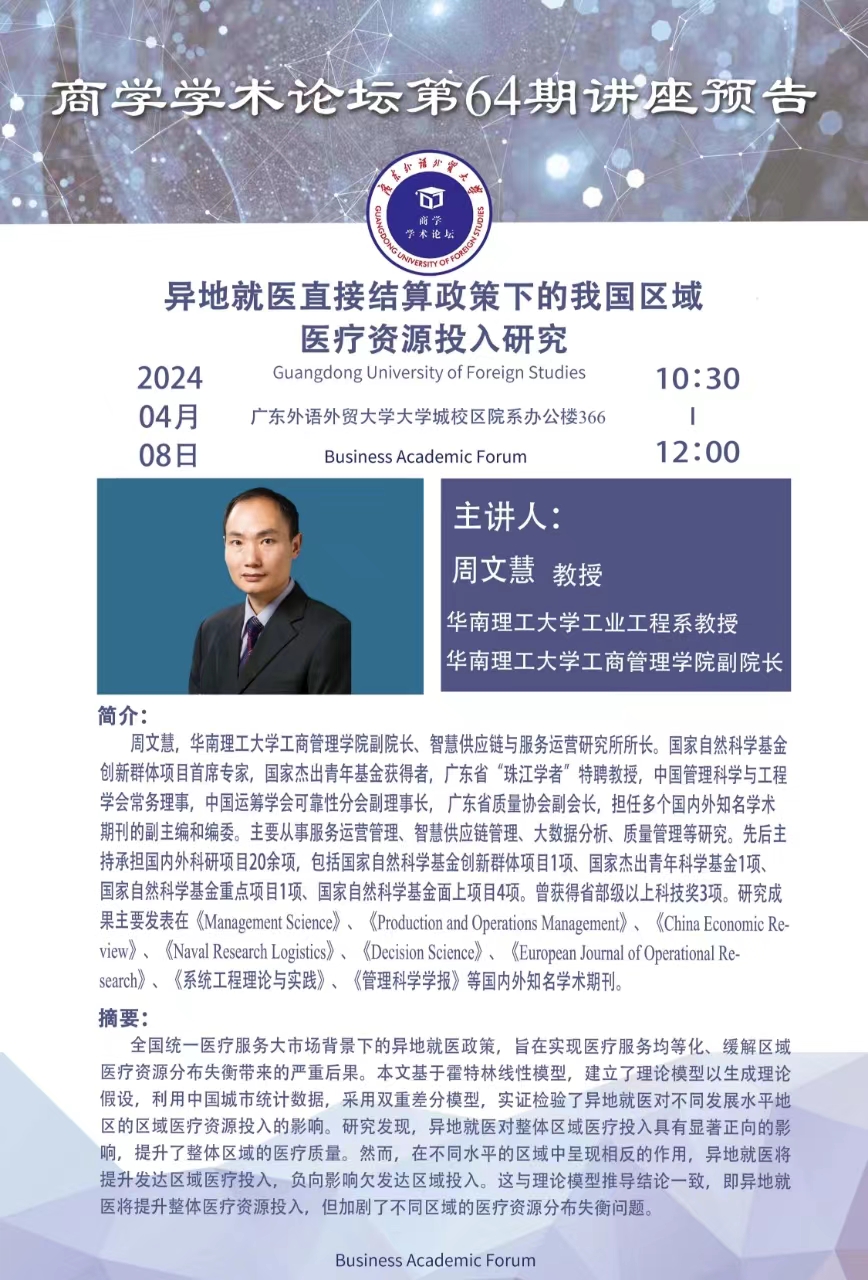 商学学术论坛第64期讲座预告 异地就医直接结算政策下的我国区域医疗资源投入研究
