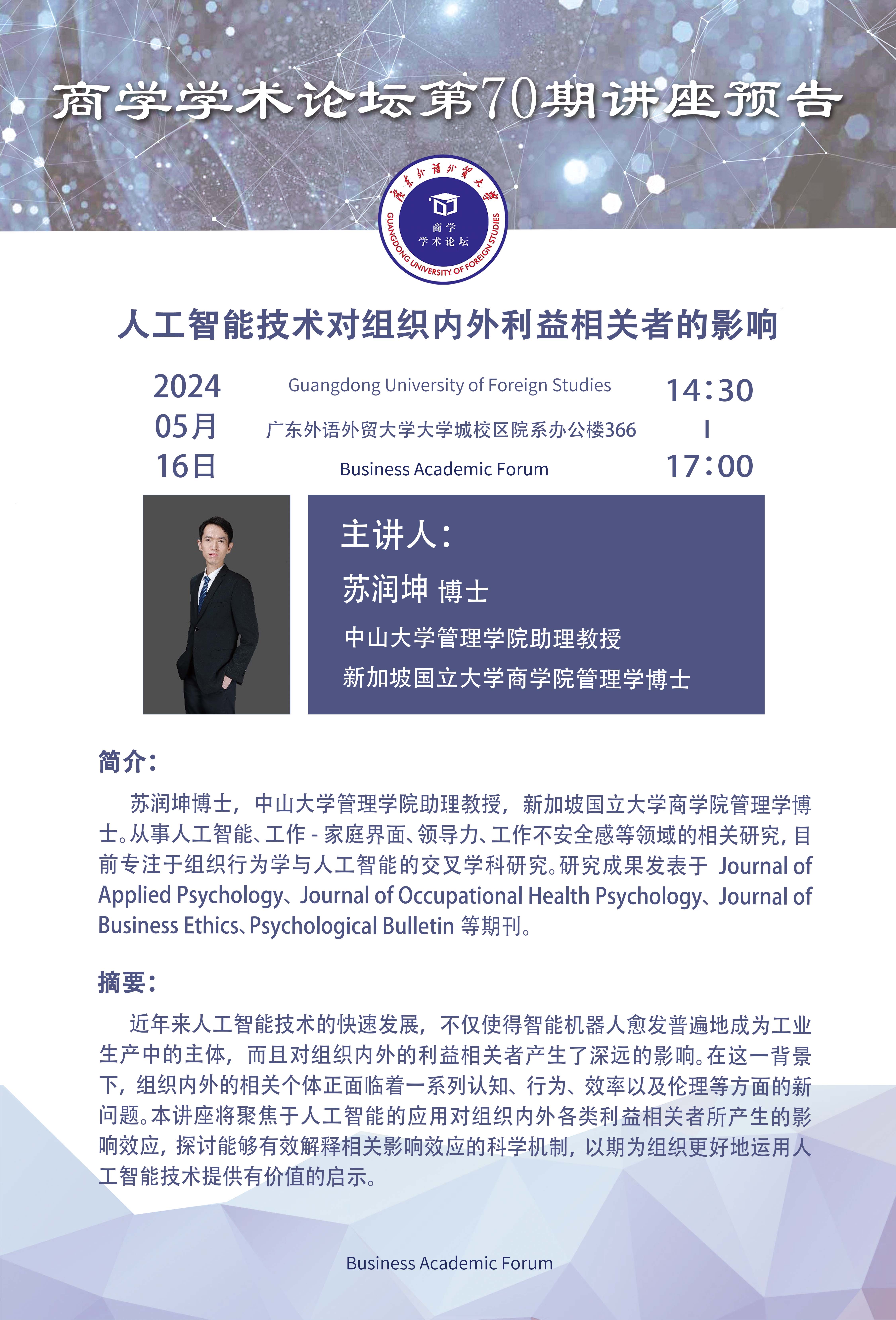 商学学术论坛第70期讲座预告 人工智能技术对组织内外利益相关者的影响