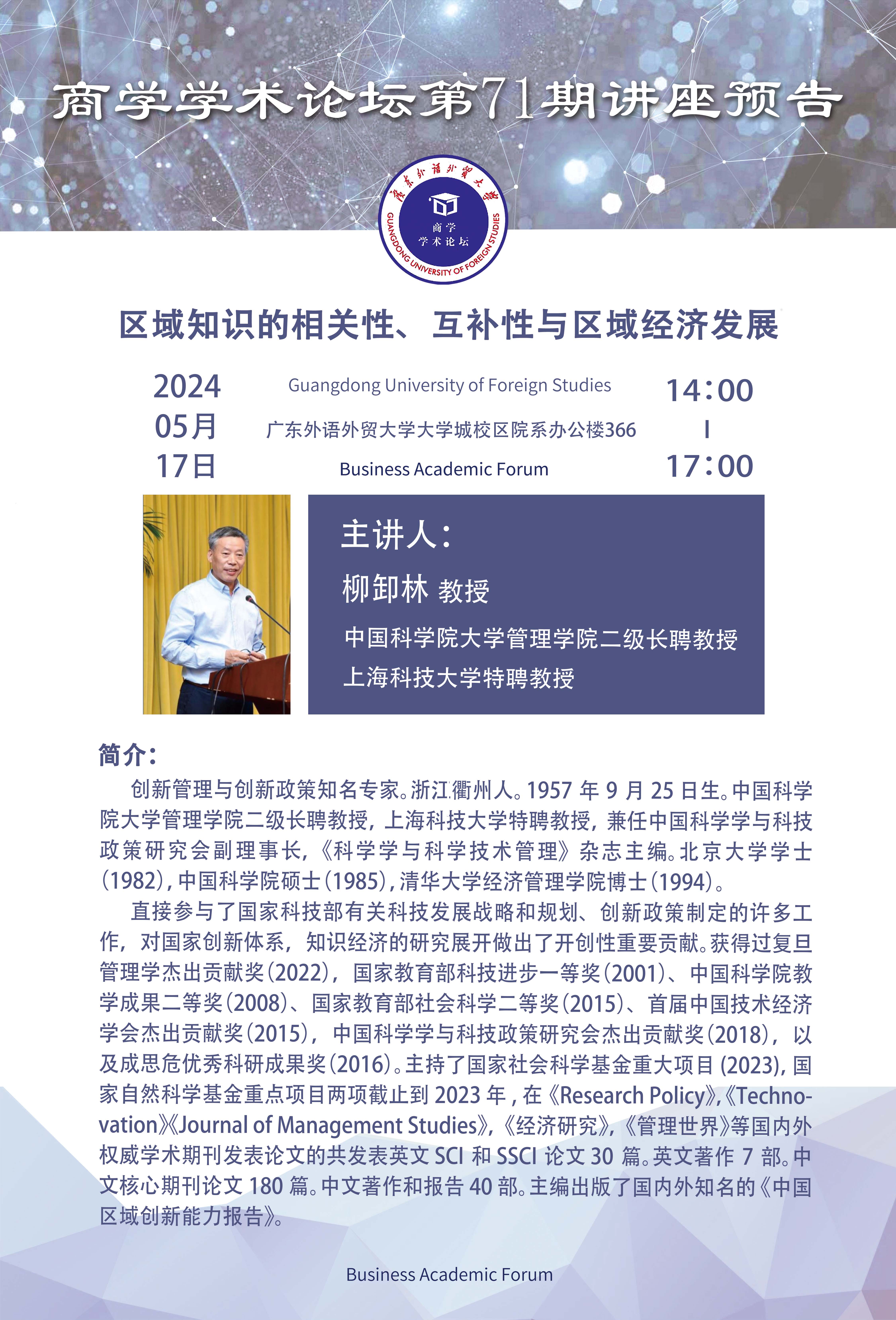 商学学术论坛第71期讲座预告 区域知识的相关性、互补性与区域经济发展