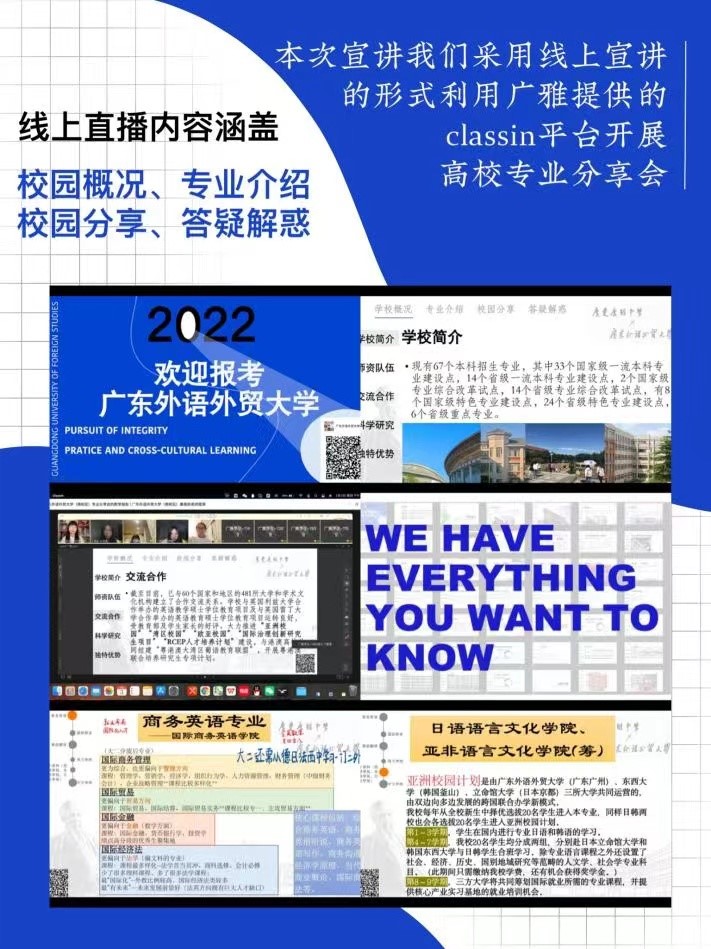 寒假期间,招生宣传活动如火如荼地开展。广外商院学子怀着对高中母校的感恩与回忆,回到了高中母校给高三学子进行宣讲。由于受到部分地区疫情影响,商院学子选择线上宣讲与线下宣传的形式相结合,采用多方位展示与经验分享结合的方式进行。接下来,让我们一睹风采。