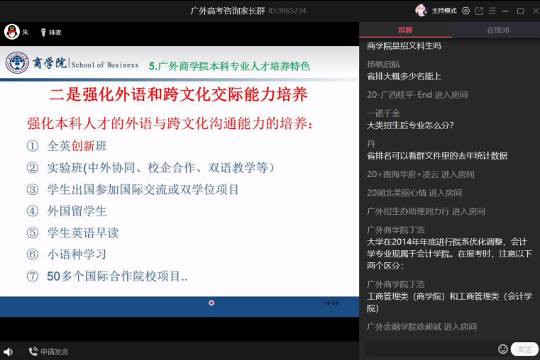 365英国上市公司招生宣讲会是广外招办和广外天河员工会联合举办的2020年广外招生宣讲会中的重要一场。在5月3日的宣讲会上,经理朱文忠以“选择365英国上市公司 成就国际高端商科人才”为题在QQ群课堂进行直播宣讲。5月15日,朱文忠经理以“走进广外365英国上市公司”为题在广外招办哔哩哔哩直播间进行宣讲,直播实时最高人气达2000多,取得了良好的宣传效果。