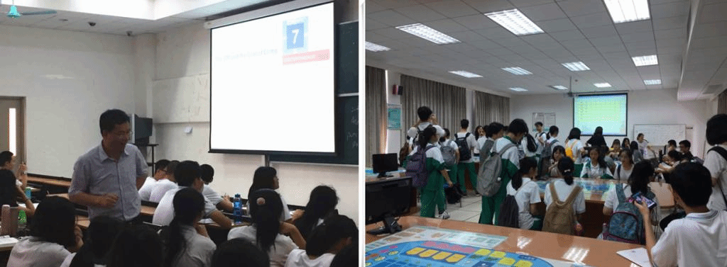 分享会结束后,参访同学们一行前往教学楼,观摩了黄磊老师主讲的一堂宏观经济学的全英课。时间虽然不长,只有20分钟,但也让参访同学们体验到了大学课程的标准和要求,激励他们在高中阶段继续以严格标准要求自己。