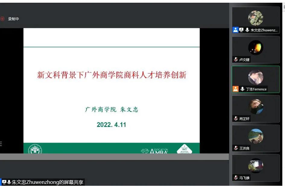 2022年4月11日下午,广外新商科专业研讨会第一讲在腾讯会议线上召开。本次会议主题为新文科背景下广外365英国上市公司商科人才培养创新,经理朱文忠担任主讲嘉宾。公司各系部主任、系部主任助理、教师和员工30余人参加研讨。会议由副经理丁浩主持。